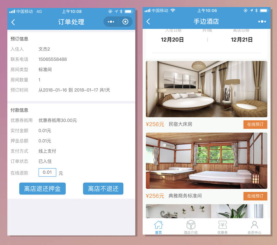 后台支持一键入住,一键退款、退押金、钟点房。支持微信支付、模板消息。客服实时收到新的订单信息,可以在手机端处理订单,支持按日期维护房价和房间数量,支持到店付款。支持积分功能,完成订房后获得的积分可以兑换代金券或优惠券,支持无线打印机和短信,评价打分功能,会员等级功能,二维码核销,积分或特产商城,会员充值(开发中)。